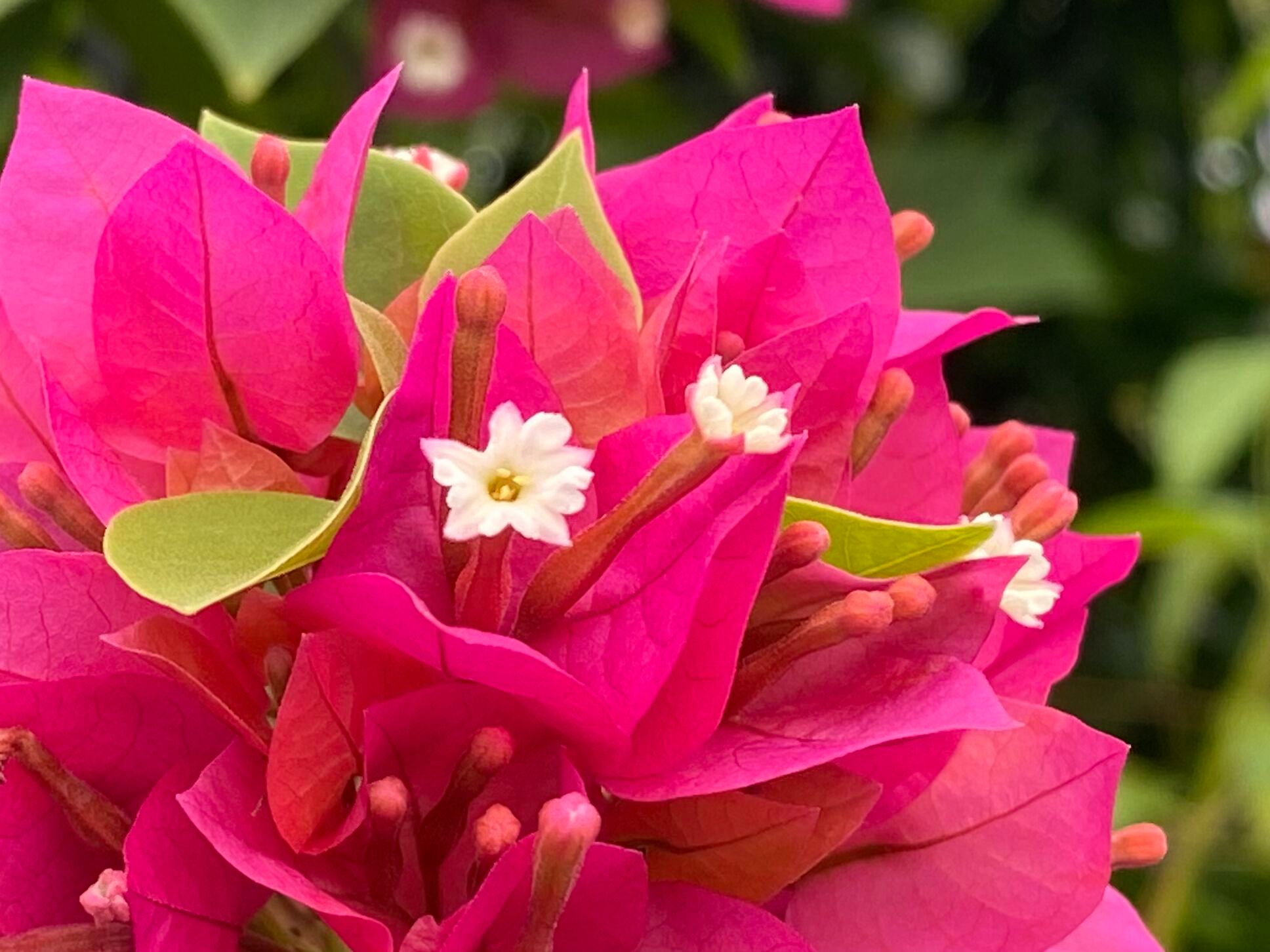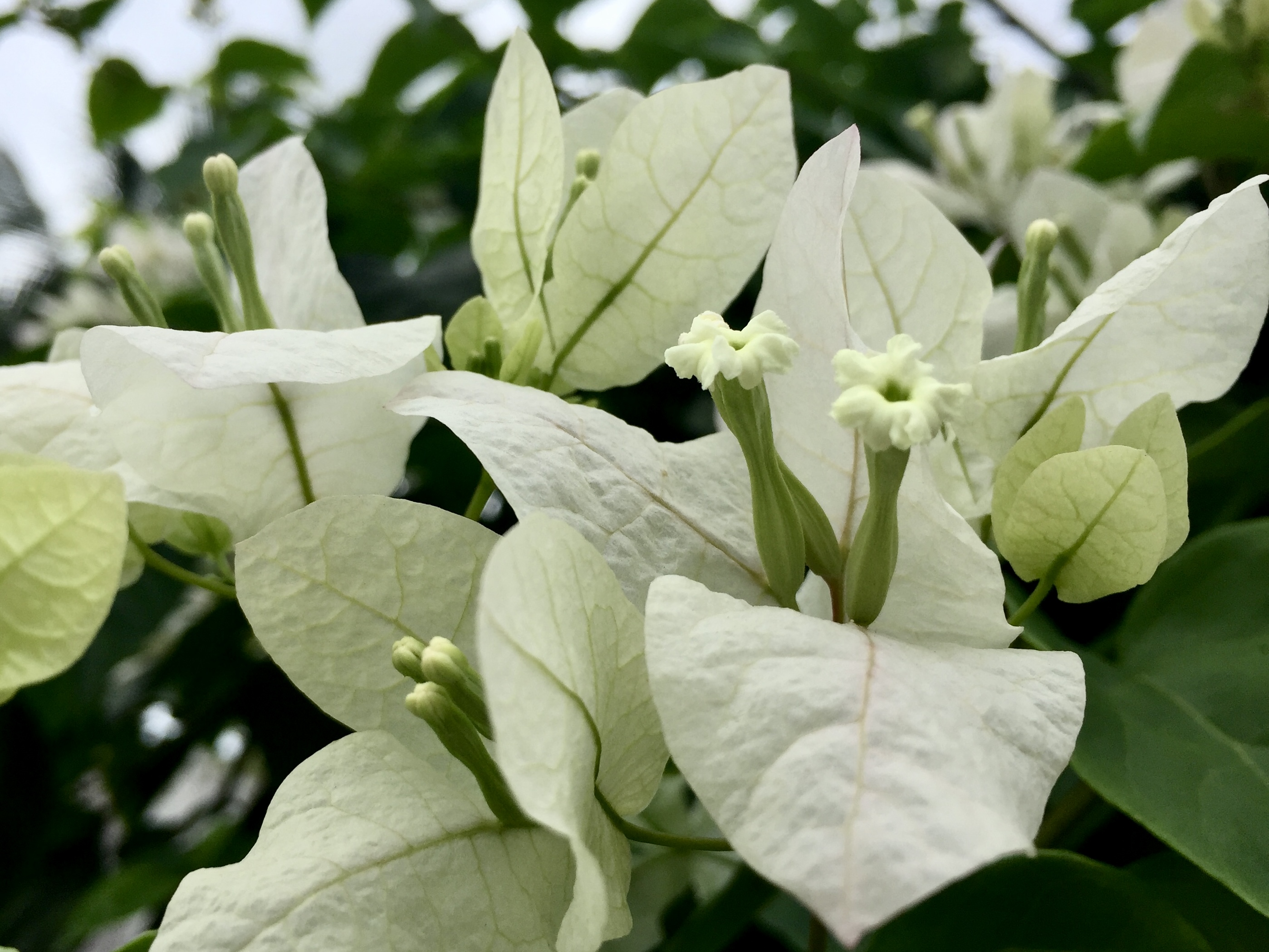 九重葛的花朵其实极小,白色或浅黄的喇叭状小花,害羞似地躲在大片的苞片里。我喜欢这一朵朵不张扬的可爱花儿,但无可否认的,我更被那些单瓣或重瓣、色彩缤纷、花非花的显眼苞片所吸引。